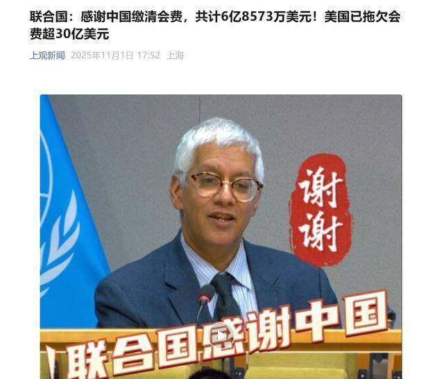 2025年10月30日,联合国方面表示,中国已经全额缴纳了本年度的联合国会费,共计6亿8573万美元。