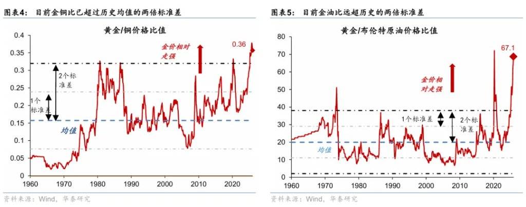 虽然这一分析角度较为片面,但如果将各类商品、资源品、以及主要股指等以黄金替代法币作为估值锚,则大部分全球资产近期均有所“贬值”。如图表4-5所示,黄金与铜、石油等大宗商品的比价均位于历史均值的2倍标准差以上,与原油比价更是达到了2020年新冠疫情期货油价跌至“负值”期间的极值。虽然去年全球主要股指均录得较大正收益,但与黄金比价均明显下跌。诚然,大部分资产的供需基本面不能与黄金相提并论,但在法币“含金量”大幅下降的背景下,我们仍有必要重新理解估值锚。