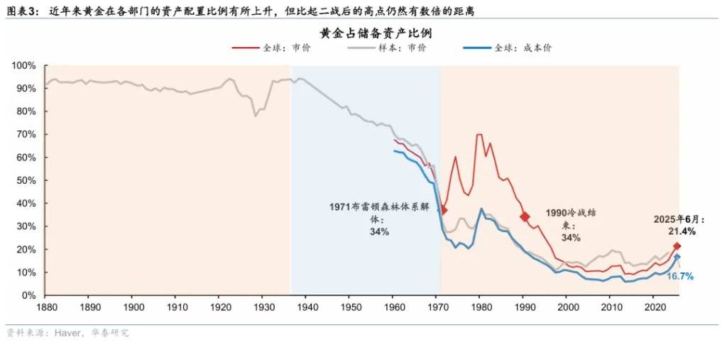 中长期看,黄金仍有配置价值。新年伊始,全球秩序重构、财政可持续性和法币公信力下降、以及AI投资大幅加速三大宏观趋势均进一步加速。虽然随着价格上升和全球(尤其央行)购金加速,黄金在各部门的资产配置比例有所上升,但比起二战后的高点仍然有数倍的距离,而在居民部门资产中占比更低(图表3)。