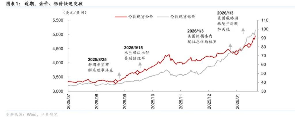 近期,金价、银价快速突破,周五(1月23日)前的两个月间,伦敦金现累计上涨25%至4,981美元/盎司,盘中逼近5000的心理关口;同期,伦敦银现跳涨112.4%,并于周五冲破100美元/盎司(图表1)。我们认为,贵金属价格短期的催化剂有以下几点: