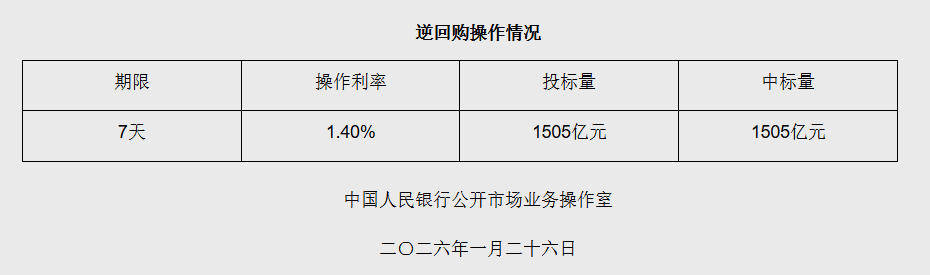 中新网1月26日电 据央行网站消息,2026年1月26日中国人民银行以固定利率、数量招标方式开展了1505亿元7天期逆回购操作。具体情况如下:
