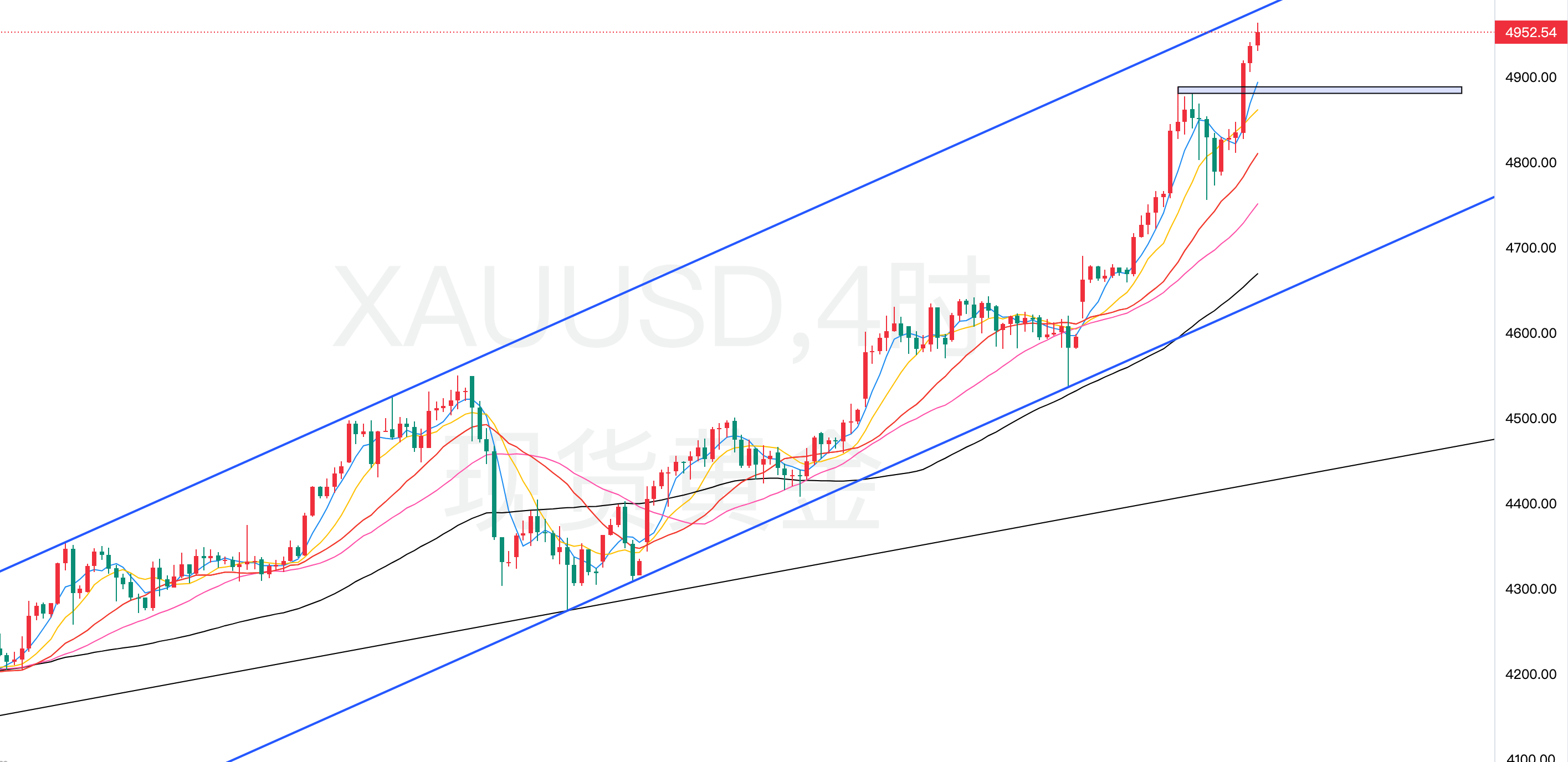 上方阻力可聚焦4980-5000区域,该区域由2025年12月12日以来的高点连线形成的阻力线延伸而来,且5000关口作为重要心理整数关口,叠加技术阻力形成强阻力区间。若价格强势突破此区间且站稳,后续可进一步关注5050附近的阻力水平。