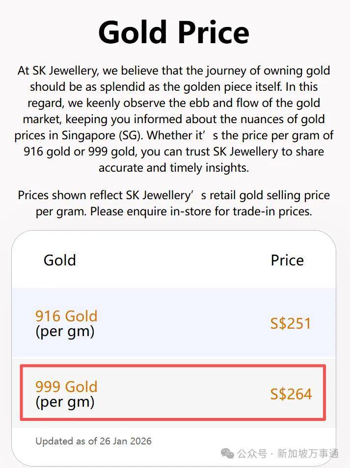 从新加坡SK Jewellery官网来看,目前黄金价格每克已经来到约262新元,相比前几年几乎翻了一倍