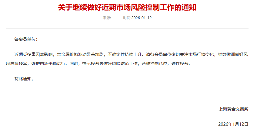 1月12日,上海黄金交易所发布《关于继续做好近期市场风险控制工作的通知》。近期受多重因素影响,贵金属价格波动显著加剧,不确定性持续上升。请各会员单位密切关注市场行情变化,继续做细做好风险应急预案,维护市场平稳运行。同时,提示投资者做好风险防范工作,合理控制仓位,理性投资。