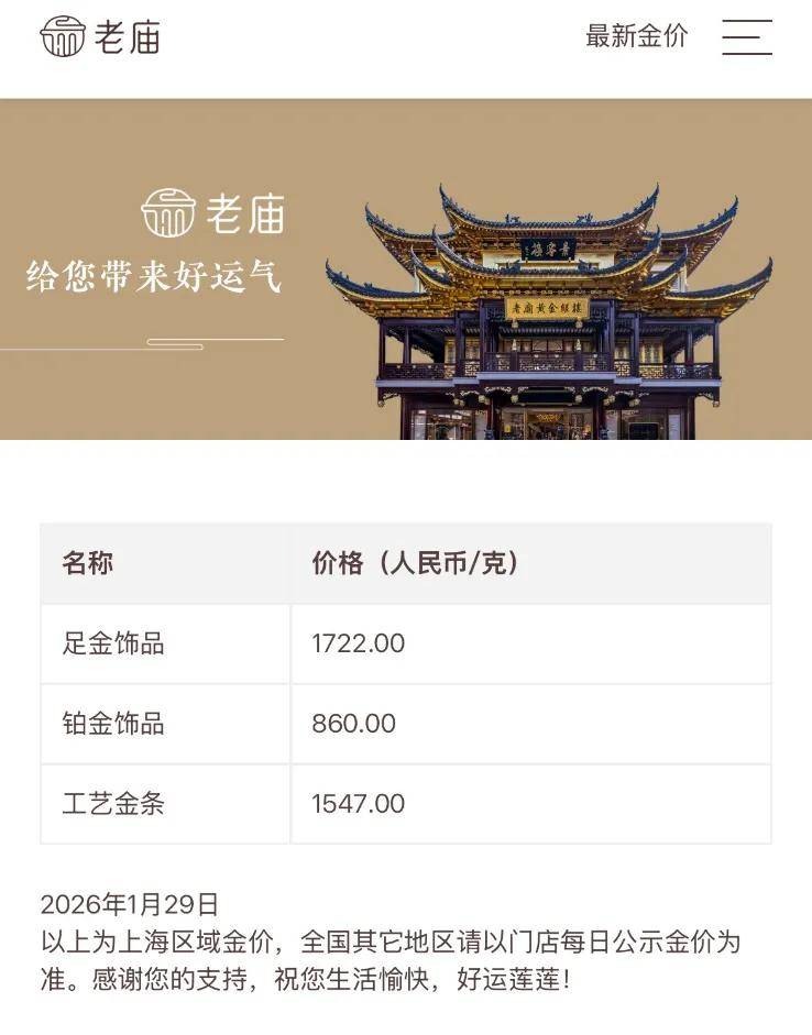 受此影响,部分国内品牌金饰价格也创历史新高,单日上涨百元左右。中新经纬29日查询发现,老庙黄金为1722元/克,单日上涨104元,周生生为1708元/克,单日上涨94元;老凤祥为1713元/克,单日上涨93元/克。