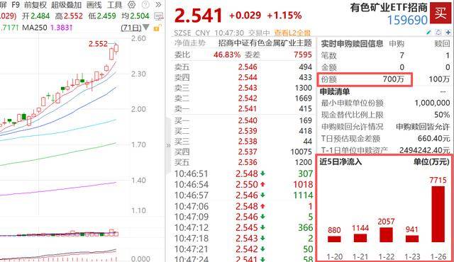 聪明的投资者早已明白,真正的机会不在于追逐单一品种,而在于把握金银铜铝组成的“全明星阵容”。在昨日有色矿业ETF招商(159690)量价齐升大涨6.31%之时,资金借道ETF积极布局这场资源长牛的最高效工具,该ETF单日获资金大额净流入7715万元,且近20个交易日中该ETF有19日获资金净流入。今日盘中,该ETF再获资金追捧,盘中涨幅超1%,且净申购份额又达600万份。
