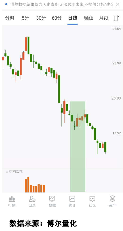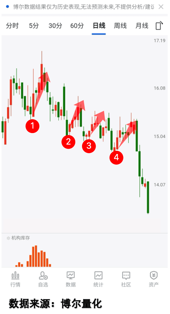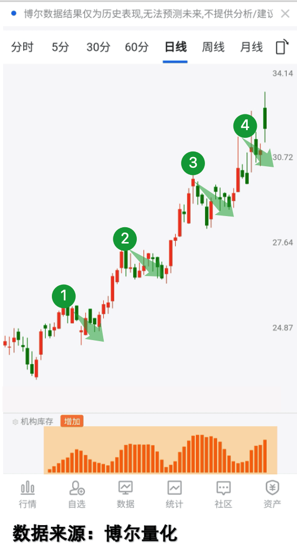 还有更坑人的,股票快速走弱后,突然连续四天飘红,看着像是资金进场的信号,行情好的时候更容易让人动心。但你看量化数据,这时候「机构库存」压根没动静,说明机构根本不认这次走强,后面果然继续调整。所以啊,别看着红柱子就冲动,数据才是真话。看图4: