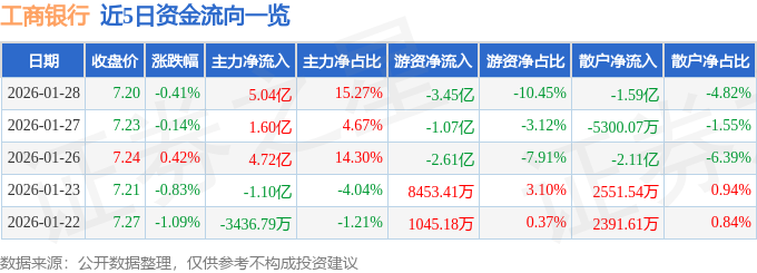 证券之星消息,截至2026年1月28日收盘,工商银行(601398)报收于7.2元,下跌0.41%,换手率0.17%,成交量456.46万手,成交额32.99亿元。