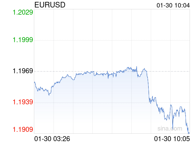 新浪外汇消息2026年01月30日,截至10时04分,外汇市场上欧元兑美元汇率跌破1欧元兑换1.1908美元。跌幅为-0.5097%