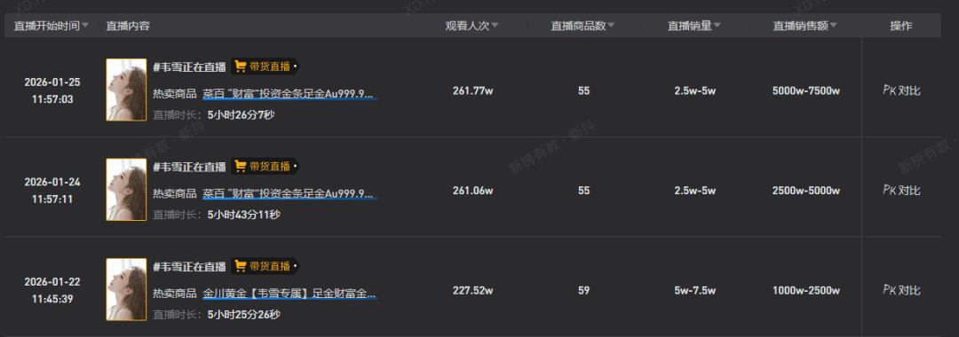 新榜数据显示,在抖音,近90天#黄金 话题播放量新增160亿次,#今日金价 话题播放量新增30亿次;在小红书,近30天黄金相关话题累计互动量新增超3077万,新增笔记超39万篇。其中,抖音博主“狗总”因为成功预测黄金走势,15天涨粉超264万,成为最近吃到最大流量红利的黄金博主;“韦雪”则在抖音连开3场黄金直播,预估GMV破亿。