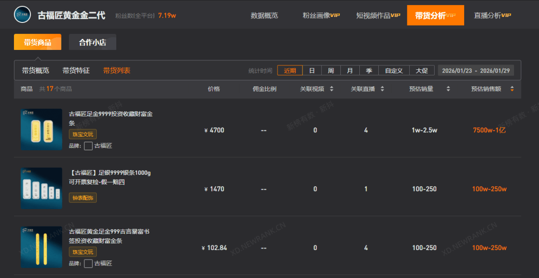 品牌商家直播间方面,近7天(2026.1.23-1.29),抖音至少有13个GMV破千万直播间。其中,“古福匠黄金金二代”“领丰金官方旗舰店”“领丰金严选”三个直播间的预估GMV更是轻松破亿,成为近7天抖音卖货最多的黄金直播间。