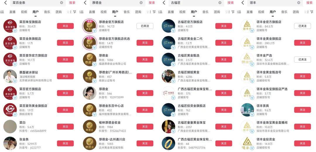 “黄金情报站”主打一个实用,化身前线解说员,通过高频跟踪黄金市场变动,在抖音3个月收获21万粉丝。“阿然爱囤金”则因为坚定看好黄金,以及时不时晒金的视觉刺激,在抖音收获近30万粉丝。