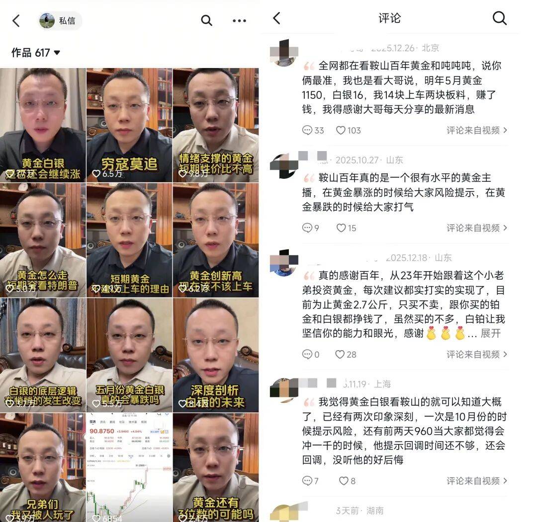 “鞍山百年黄金”凭借准确率极高的预测,以及让人信任感十足的老干部风视频,成为最近讨论度仅次于“狗总”的黄金博主。一位网友留言:“给我们提供这么准确的信息,已经超过网上80%的博主,我会一直相信鞍山百年。”