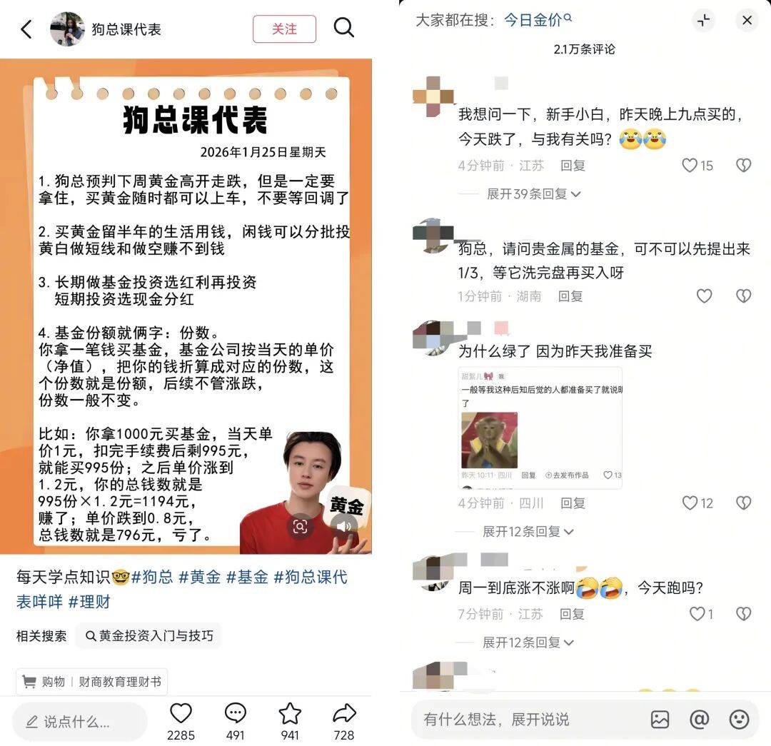 此时,黄金博主们凭借敢于给出投资建议,并身体力行加入购金大军,和网友形成情绪共鸣,迅速吸引到一大批对黄金感兴趣的网友。