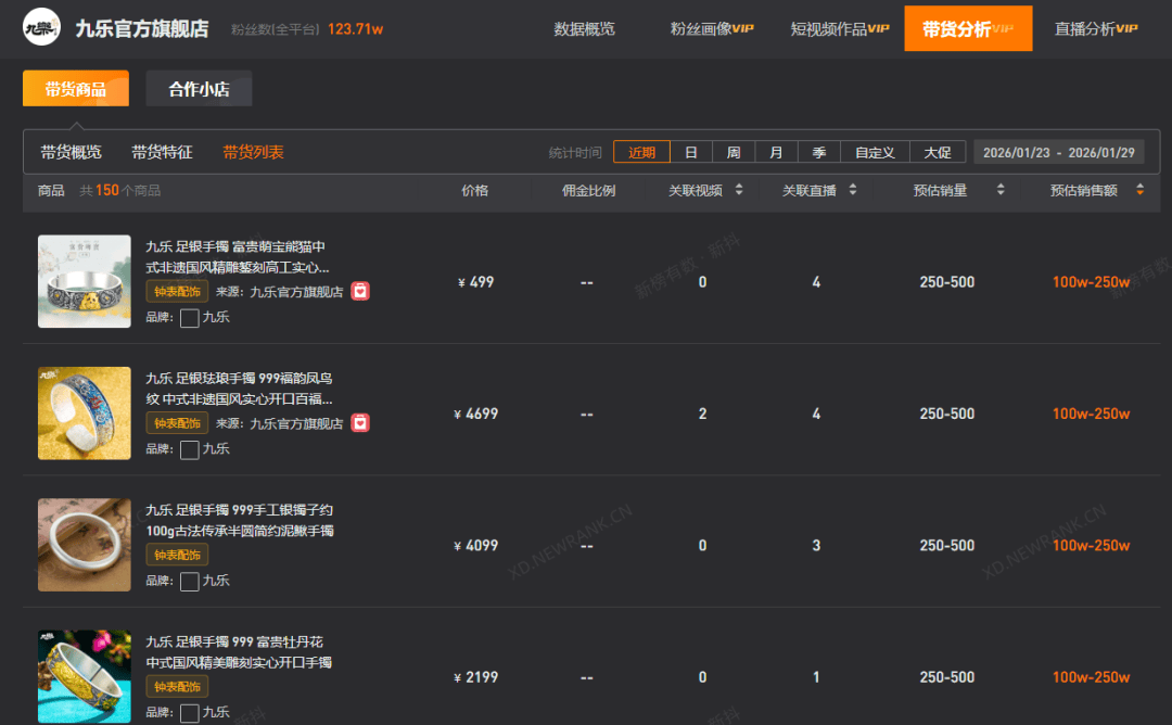 九乐是湖南知名白银品牌,以售卖非遗白银饰品为主。新抖数据显示,近7天,“九乐官方旗舰店”有5款足银手镯预估GMV超百万,累计预估GMV2500万-5000万元。