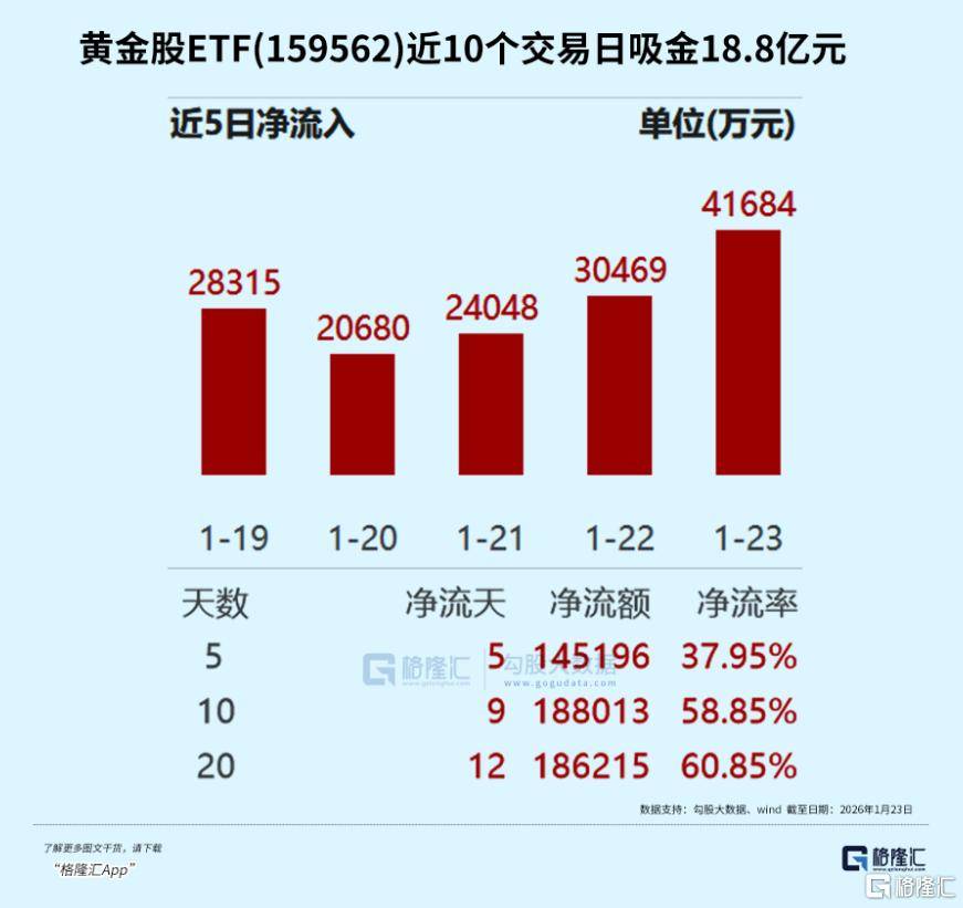 国内方面,2026年1月份尚未结束,黄金ETF华夏(518850)的涨幅已经达到17.32%,近20个交易日获23.98亿元资金流入,最新规模达152.92亿元;素有“金价放大器”之称的黄金股ETF(159562)年内涨幅38.01%,近10个交易日吸金18.8亿元,规模增至57.94亿元。