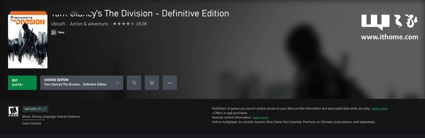IT之家 2 月 3 日消息,育碧现已悄悄在微软 Xbox 商店推出了《全境封锁:终极版(Tom Clancy's The Division:Definitive Edition)》,该版本并非重制版游戏,只是收录了游戏本体及多款 DLC,定价为 49.99 美元(IT之家注:现汇率约合 347.5 元人民币),IT之家附游戏商品页(https://www.xbox.com/en-us/games/store/tom-clancys-the-division-definitive-edition/9pgffb0wzpkh)。
