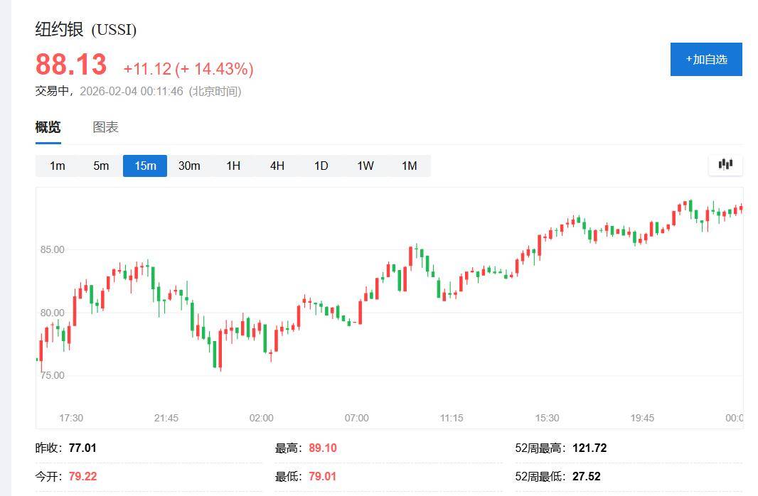 美股盘前刷新日高时,周一盘中曾逼近77美元、日内跌超9%的纽约期银涨至89.10美元,日内涨15.7%,周一曾跌破71.40美元、日内跌逾16%的现货白银涨至89.16美元上方,日内涨近12.5%。