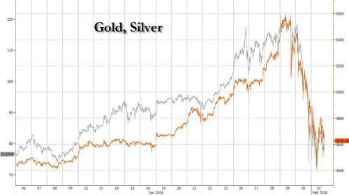 最新的市场动态显示,金银价格在经历猛烈回调后试图企稳。据高盛的数据,此次抛售在某些指标上甚至超过了以往的极端行情,COMEX黄金和白银创下了自1980年代初以来最大的单日跌幅。虽然价格已从低点回升,但波动率仍处于极高水平,期权流动性一度枯竭,这表明市场结构依然脆弱,短期内可能仍将面临不稳定的双向价格波动。