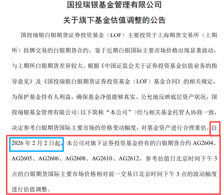 自2月2日起,按国际银价“当天下午3点”较“上一个交易日下午3点”的涨跌幅进行估值。
