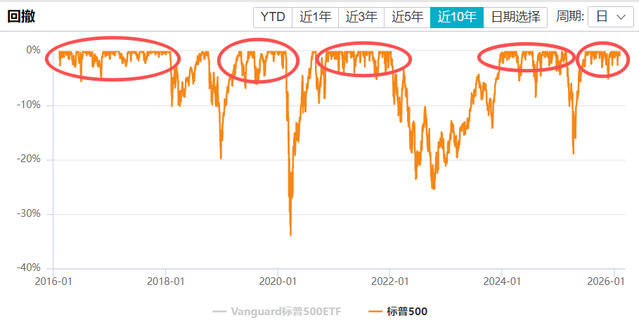 看最大回撤的话,10%的回撤对美股来说是平常,隔一段时间就会出现。不算去年4月的调整,过去一年美股最大回撤不超过6%,走的太稳了,我们组合持有较多美股,在这里也先打个预防针,注意波动风险。