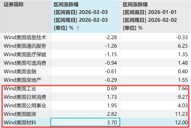 仔细观察的话,其实不止昨天,今年以来都是这样,工业、消费、公用事业、能源、材料等美股传统行业大涨,科技行业是截至2月2日美股唯一下跌的行业。