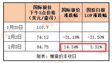 按照这个方式,2月3日,国际银价涨了14.34%,基金为什么只涨3.31%呢?