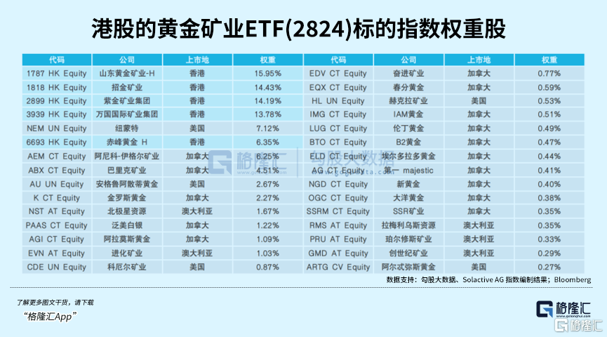 金矿资源方面,有港股的黄金矿业ETF(2824),紧密跟踪Solactive全球黄金矿业精选指数,覆盖中国、加拿大、美国、澳大利亚四大黄金产业区30只龙头股,兼顾地域分散与龙头集聚优势,有效减低单一市场风险,共享全球黄金矿业增长红利。