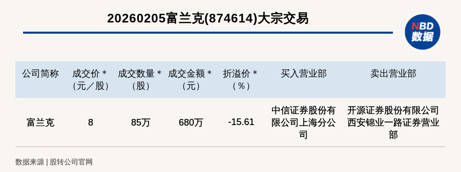 每经讯,2026年2月5日,新三板创新层公司富兰克(874614,收盘价:9.48元)发生一笔大宗交易,成交价8元/股,成交数量85万股,成交金额680万元,折价15.61%。买入营业部是中信证券股份有限公司上海分公司,卖出营业部是开源证券股份有限公司西安锦业一路证券营业部。