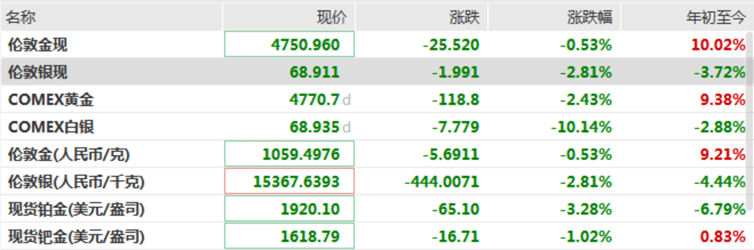 截至发稿,现货黄金跌0.53%,年初至今涨10%;现货白银跌2.81%,报68.911美元/盎司,年初至今跌3.72%。