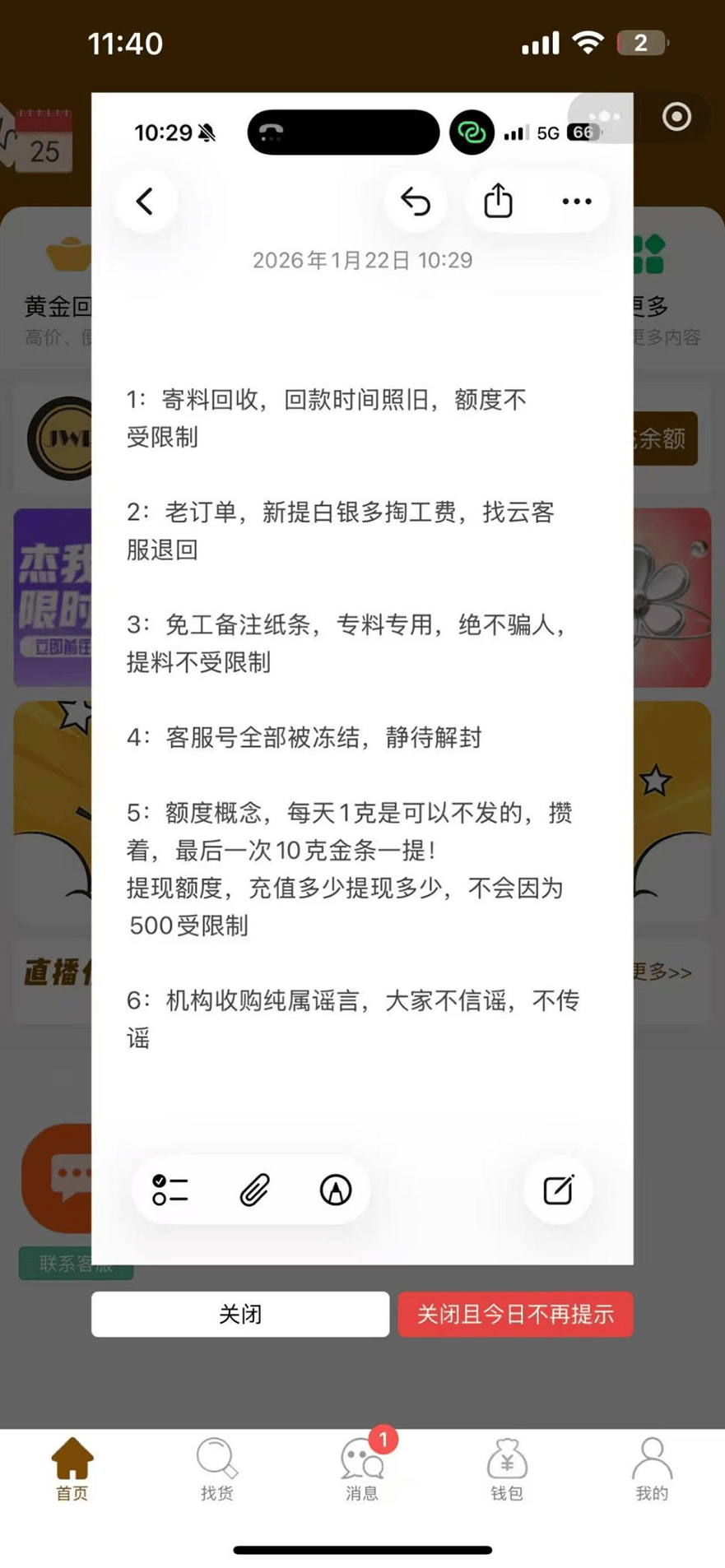 1月初,林晓雨向杰我睿旗下“金城金世界”小程序充值1.4万元,寄去40克旧金,又在平台购买40克黄金,计划置换古法手镯。可不到20天,平台便出现兑付延迟,客服集体失联,提现、换款全面停止,即便后期推出“每日每账户限提500元或1克黄金”的规则,也仅少数人能兑付。