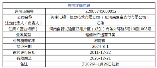 1月30日,央行更新了注销许可机构名单,其中显示,聚宝支付的支付牌照被注销。具体来看,该公司首次获得支付许可的时间为2011年12月22日,最后换证日期为2024年8月1日,不到两年时间后,今年1月26日被正式注销牌照。