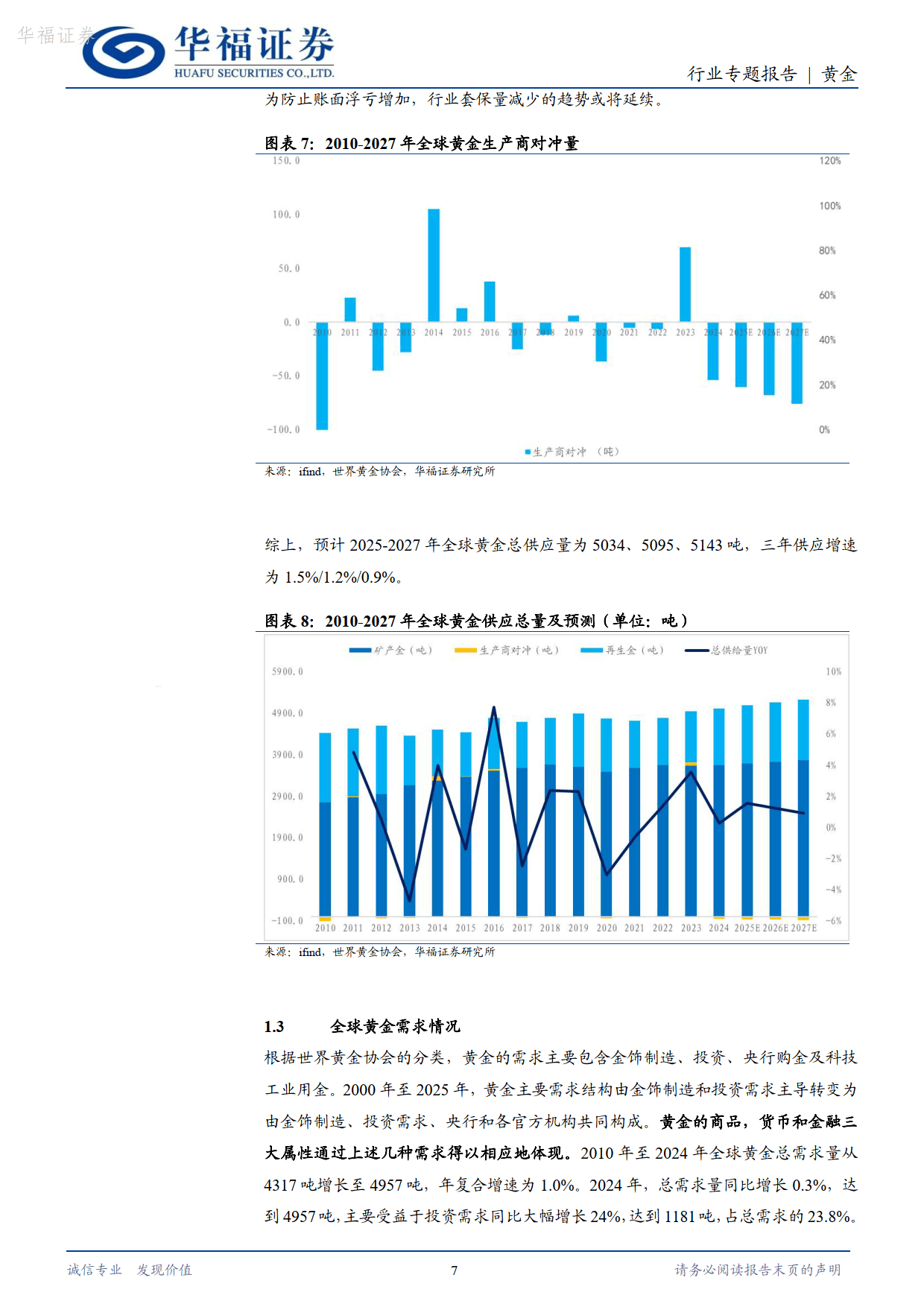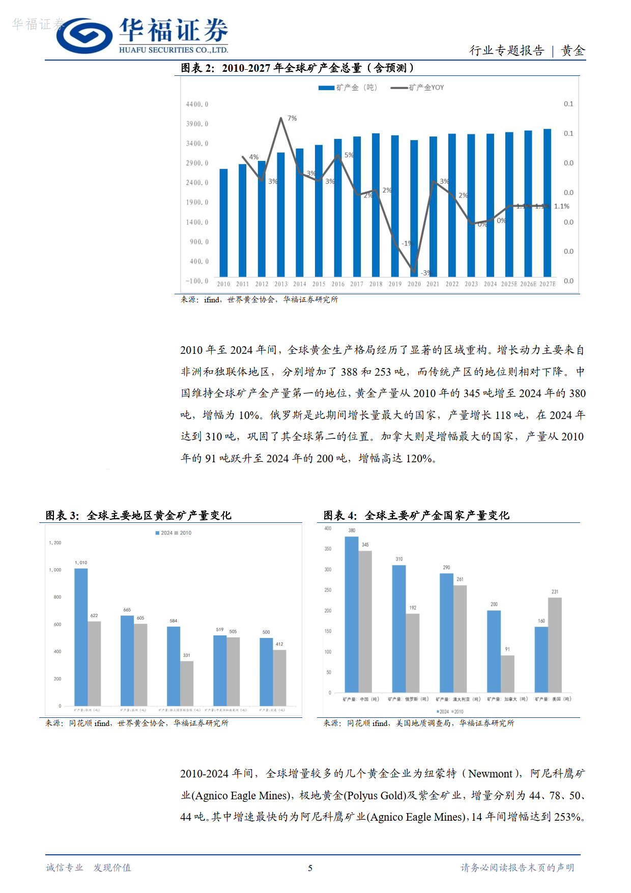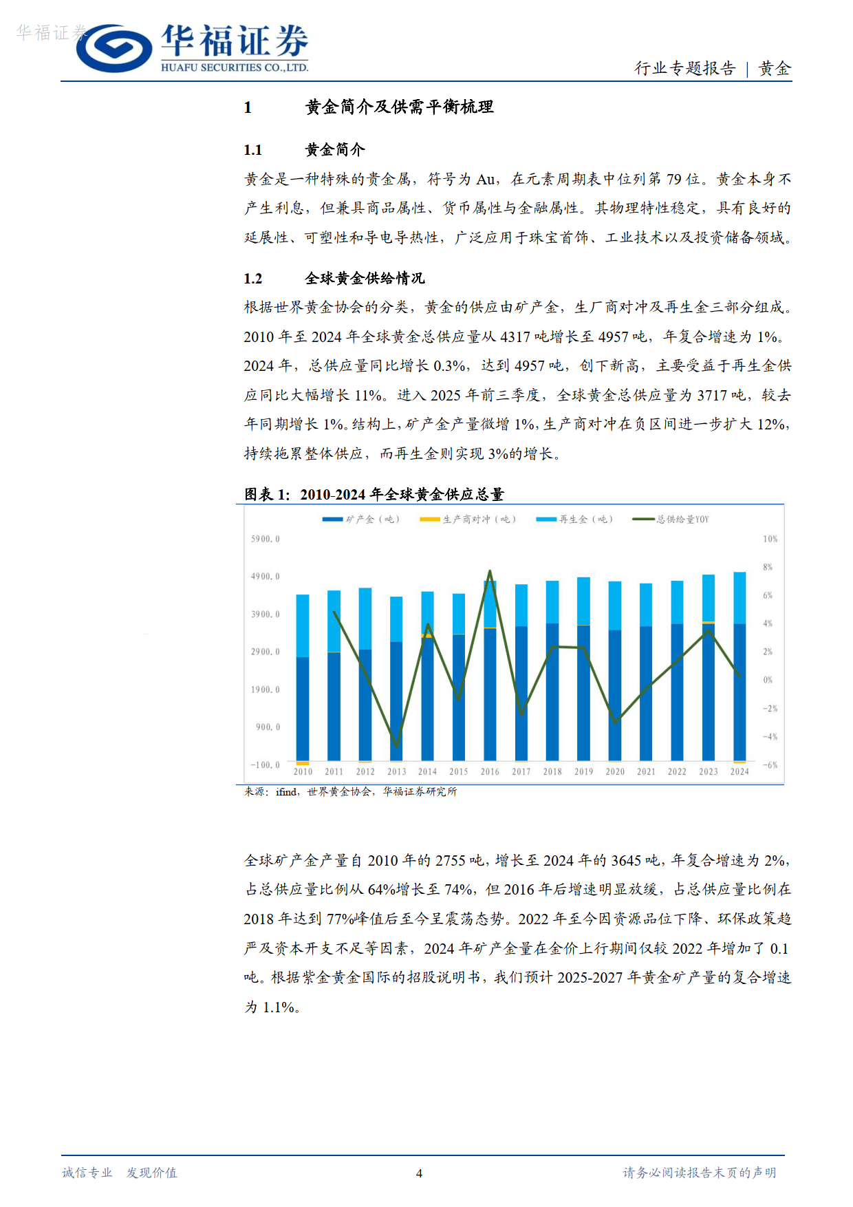 黄金作为兼具商品、货币与金融属性的特殊贵金属,应用于珠宝首饰、工业技术及投资储备等领域。2010-2024 年全球黄金总供应量从 4317 吨增至 4957 吨,年复合增速 1%,其中矿产金占比升至 74%,但 2016 年后增速放缓,近年供应增长主要依赖回收金。预计 2025-2027 年总供应量分别为 5034、5095、5143 吨,增速逐步放缓。