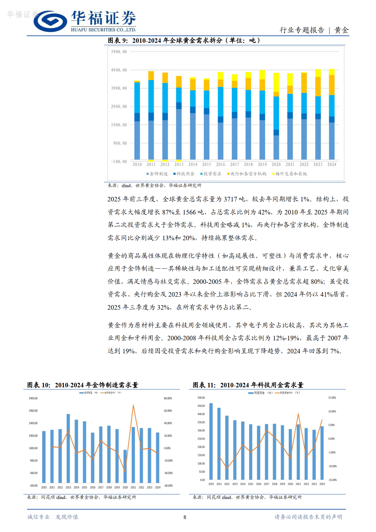 需求端结构已从金饰制造和投资主导,转变为金饰、投资、央行购金共同支撑。2024 年总需求量达 4957 吨,投资需求同比大增 24%;2025 年前三季度投资需求占比升至 42%,而金饰、央行购金需求有所下滑。