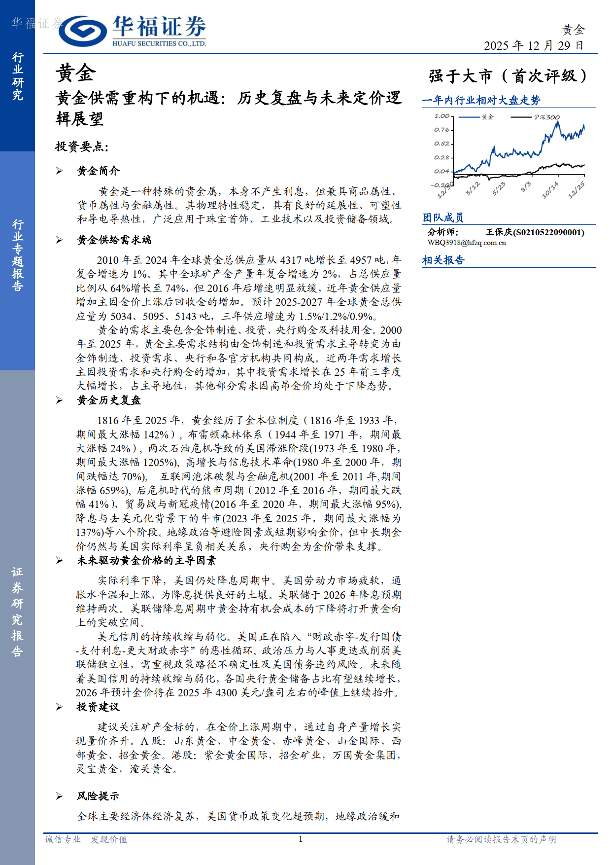 1816 年至今,黄金经历八大发展阶段,地缘政治等短期因素影响金价,但中长期与美国实际利率呈负相关,央行购金提供重要支撑。当前处于 2023-2025 年降息与去美元化背景下的牛市,期间最大涨幅达 137%。