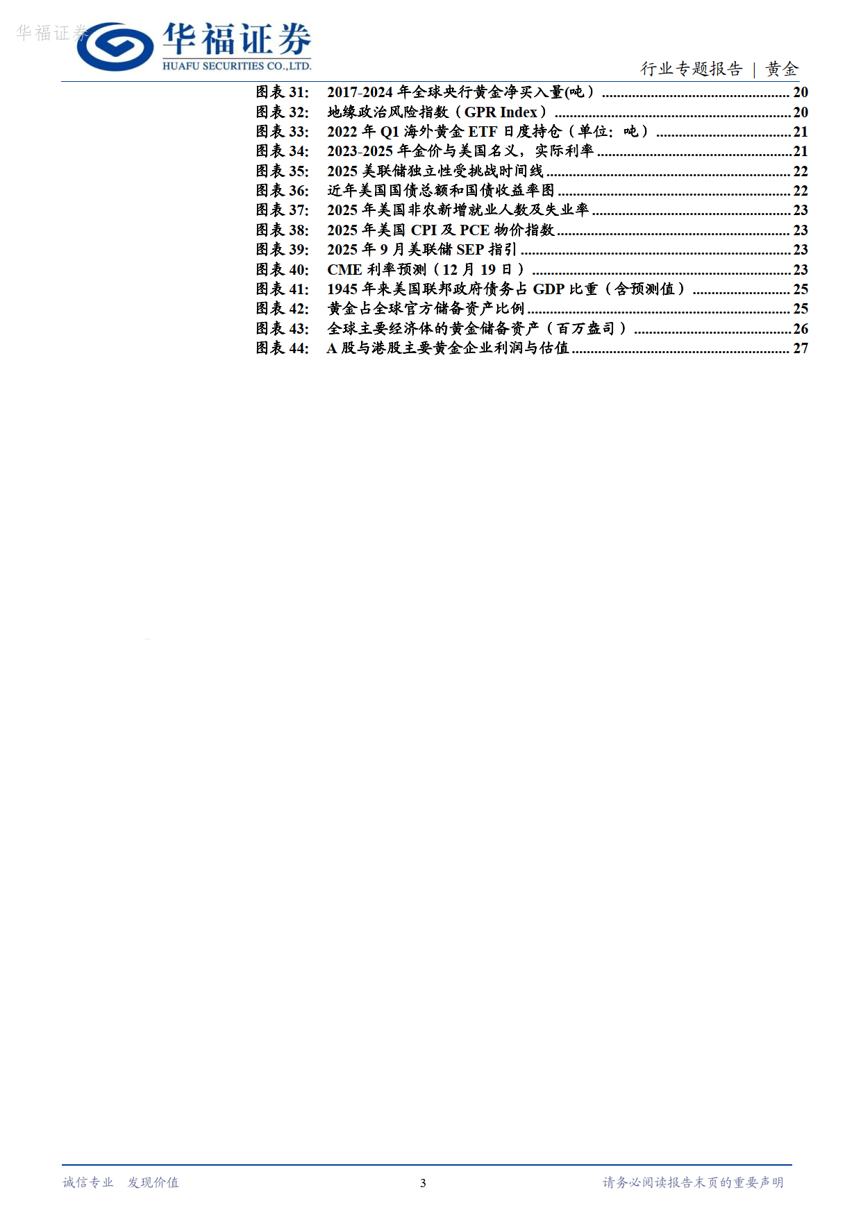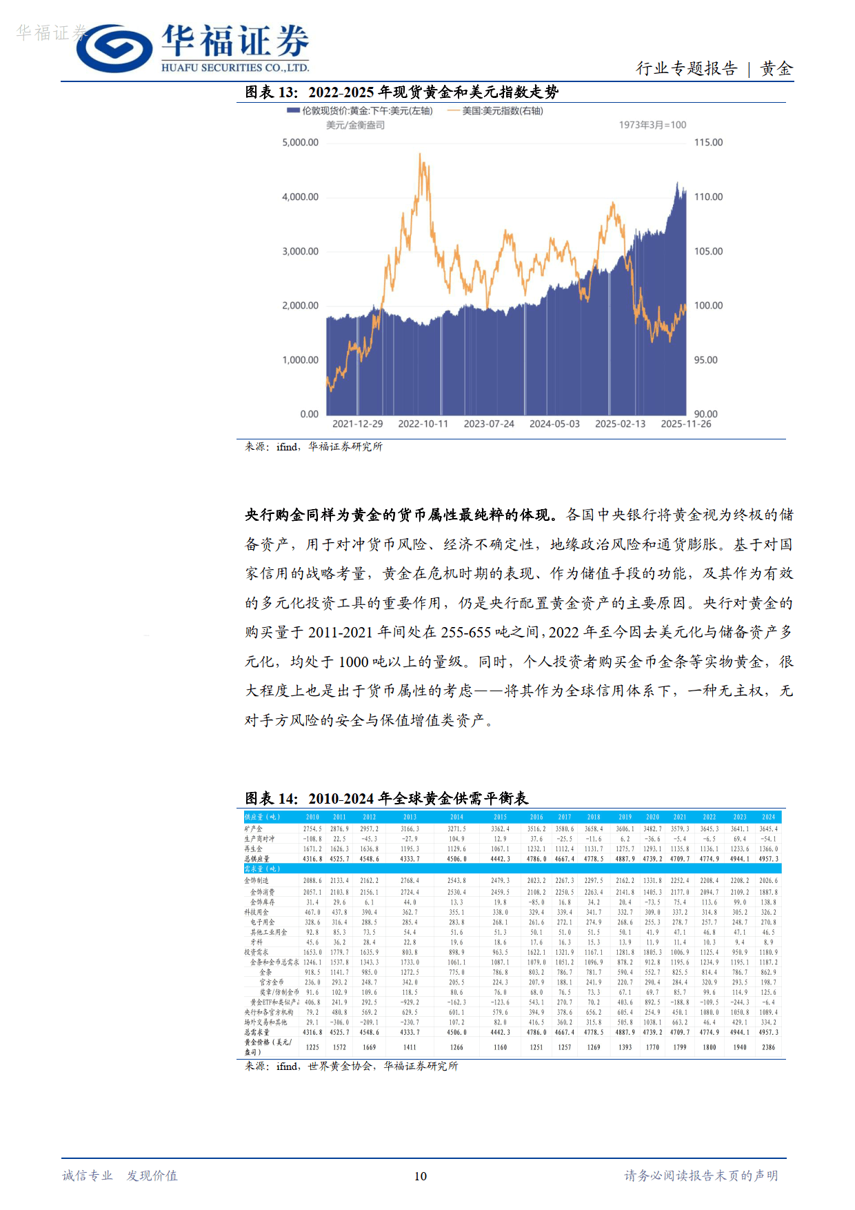 未来金价核心驱动因素有二:一是美国劳动力市场疲软、通胀温和,美联储 2026 年仍有两次降息预期,降低黄金持有成本;二是美国陷入财政赤字恶性循环,美联储独立性受挑战,美元信用弱化,去美元化进程推动各国央行持续购金,2022-2024 年央行年购金量均超 1000 吨。预计 2026 年金价将在 2025 年 4300 美元 / 盎司峰值基础上继续抬升。