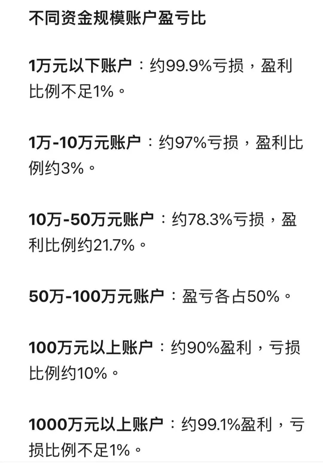 这个数据是结算中心的统计。而且是真实的,其实这背后就是,对资金的认知和承受。资金越小,想要的就越多,渴望越多,就越想赚快钱,折腾的就越多,相反亏损就越多。而资金越大,认知到了,就放低了预期,拉长了周期,折腾的也就越少。越能赚到钱。这既是人性的一个最直白的体现。所以当有了大资金思维,慢慢在理解主力意图,把握趋势关键就轻松不少。也希望我的朋友们,尽早都有大资金思维,或者慢慢的都跟着我赚到大资金队伍里。