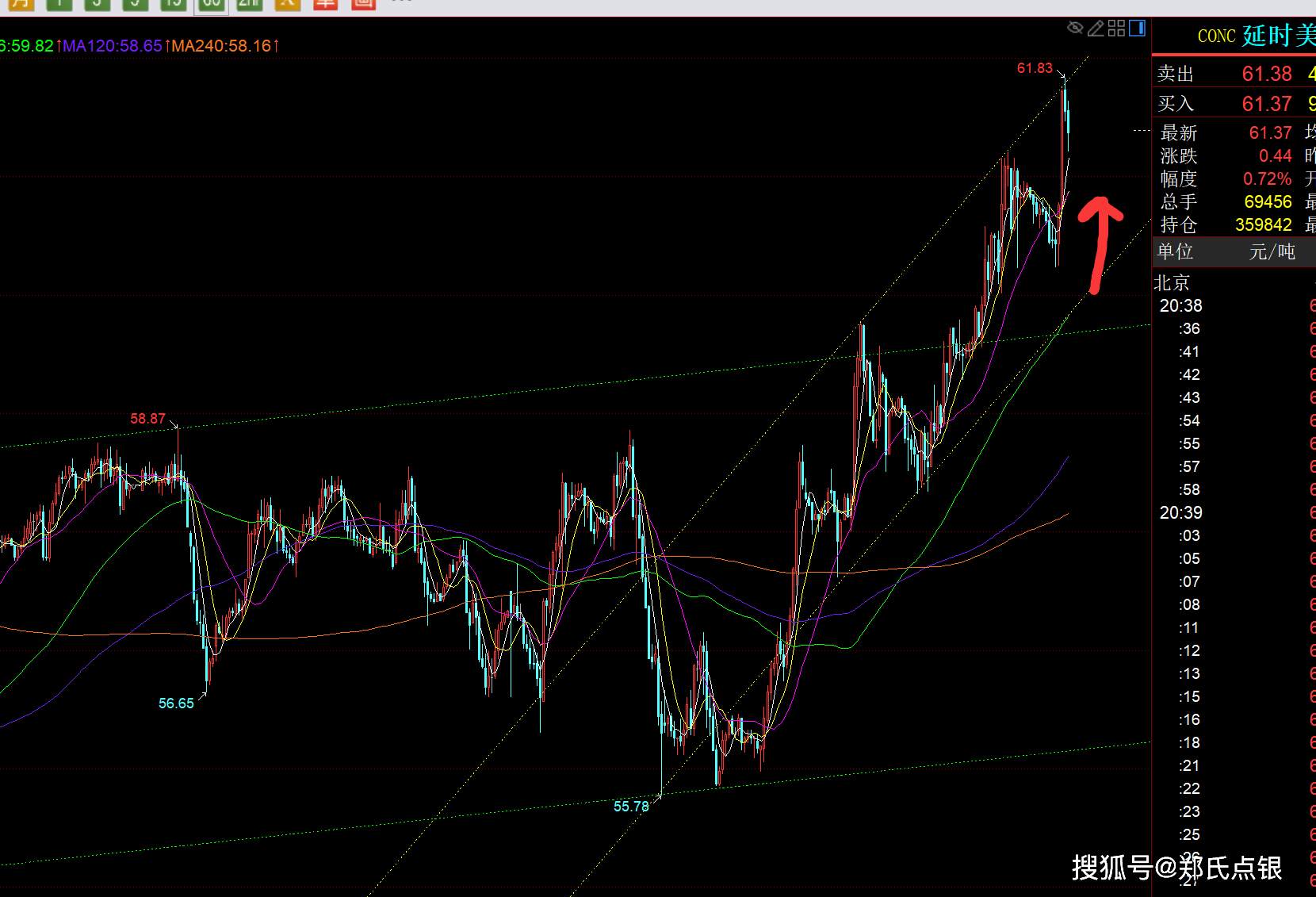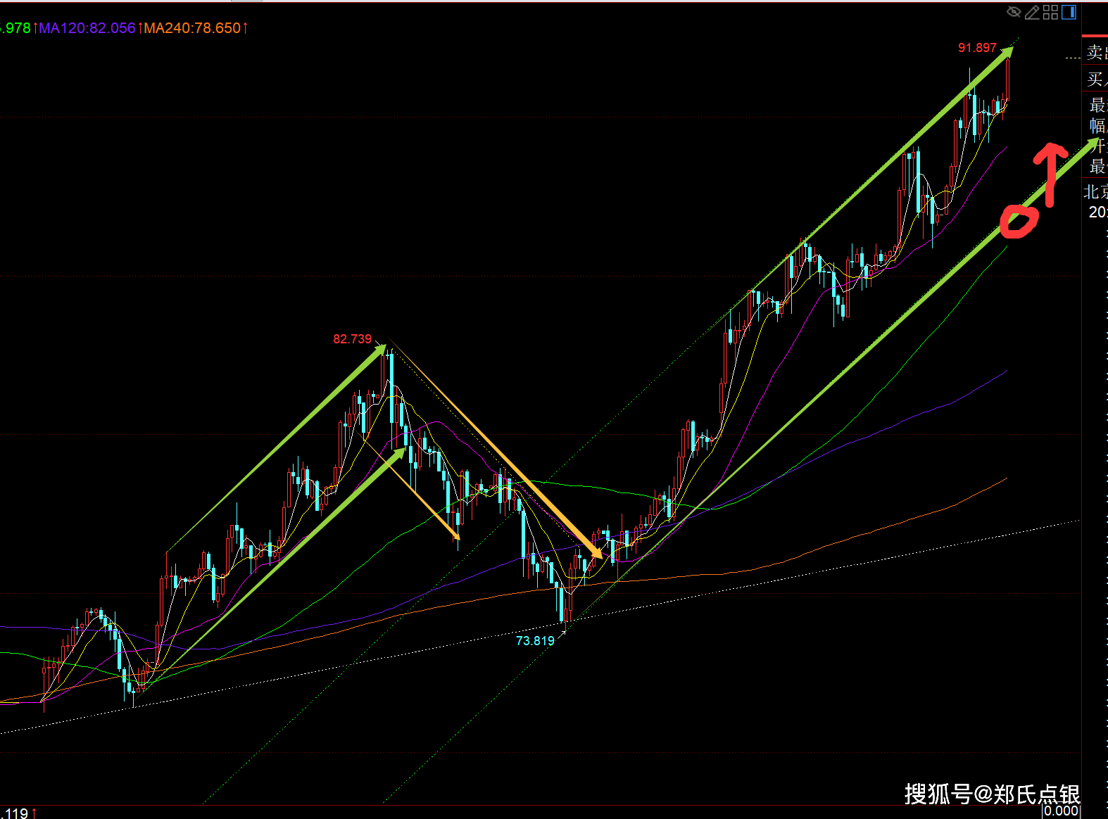 第二,白银方面:北上之路继续坚持,前两周70波段北上,74波段北上,这周85、86陆续继续波段北上,一路单边拉升走高,今日最高快逼近92一线;