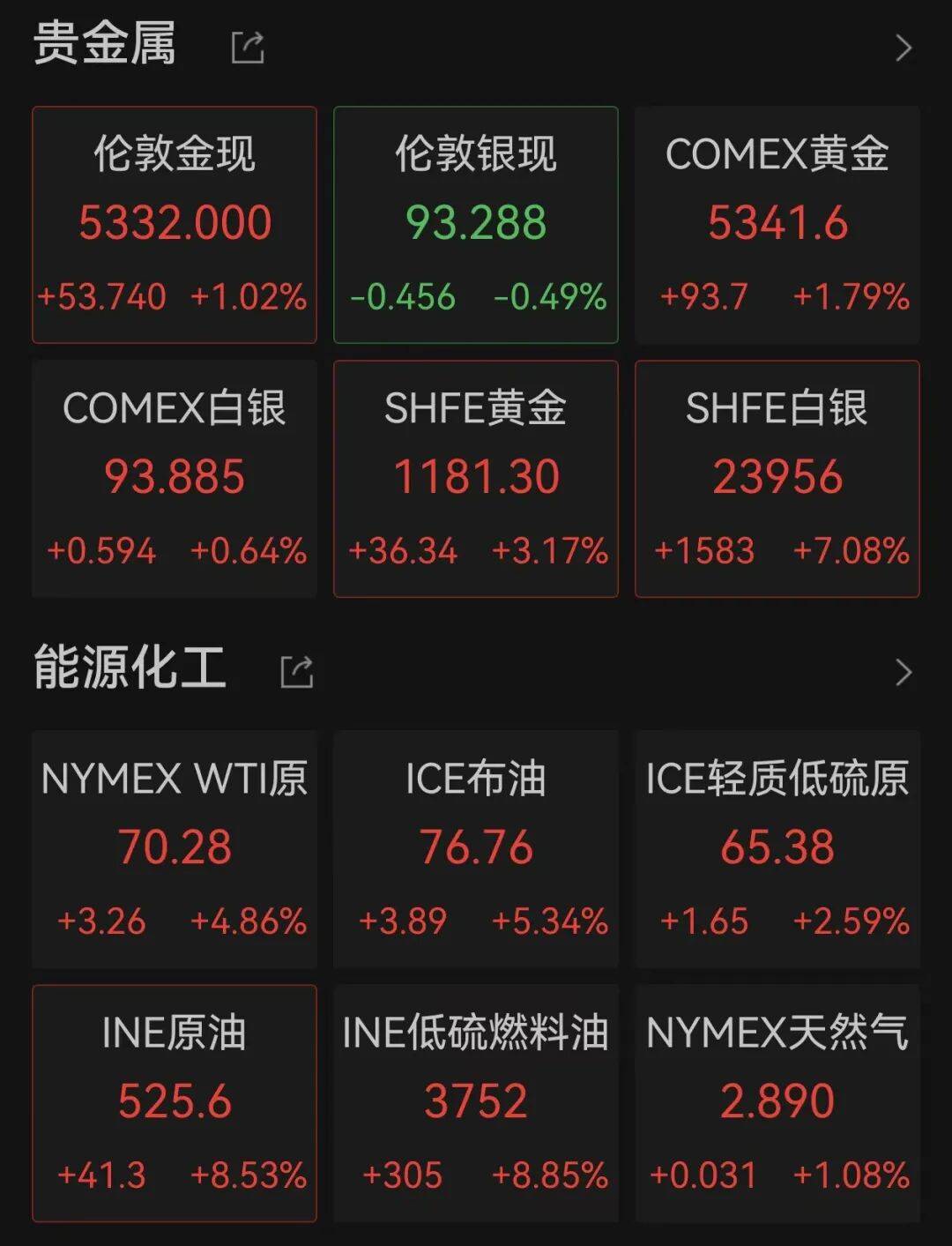 截至9:41,布伦特原油期货上涨5.34%,WTI原油期货上涨4.86%;伦敦金现上涨1.02%,报5332美元/盎司;COMEX黄金期货上涨1.79%,报5341.6美元/盎司;伦敦银现跌0.49%,报93.228美元/盎司;COMEX白银期货上涨0.64%,报93.885美元/盎司。