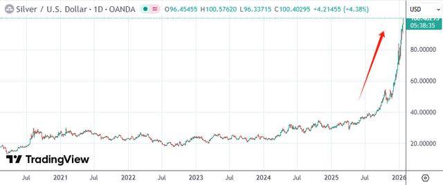 在避险资产需求激增、全球各地散户疯狂买入推动下,现货白银价格历史性地突破了每盎司100美元大关,延续了近期的炽热涨势。