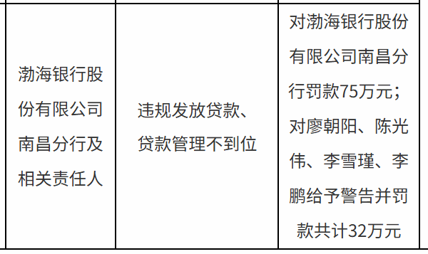 罚单显示,渤海银行股份有限公司南昌分行的主要违法违规行为是:违规发放贷款、贷款管理不到位。