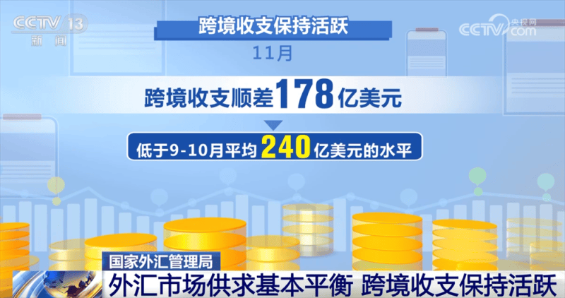 外汇市场供求延续基本平衡。11月,银行结汇和售汇规模均保持稳定,结售汇顺差157亿美元,与10月基本相当。