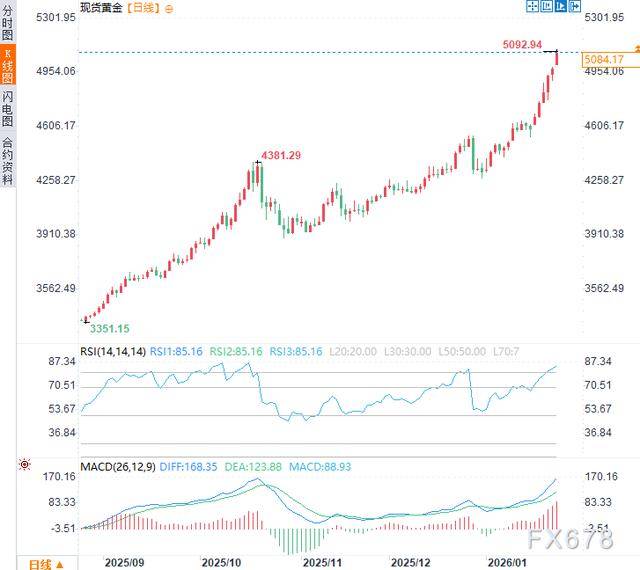 汇通财经APP讯——黄金价格的上涨令人叹为观止,同时也令人深感不安。周一(1月26日)亚市时段,现货黄金震荡上行,现交投于每盎司5090美元附近,日内涨幅约2.1%,截至10:35,一度触及5092.94美元/盎司的新高。