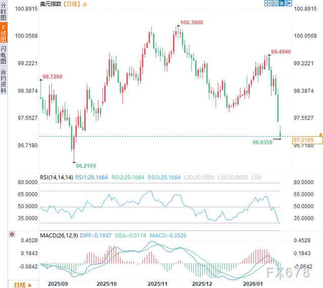 周一亚市时段,美元指数震荡下行,现交投于97.00附近,日内跌幅约0.45%,延续前两个交易日的显著下行趋势,一度触及96.94的超四个月新低。