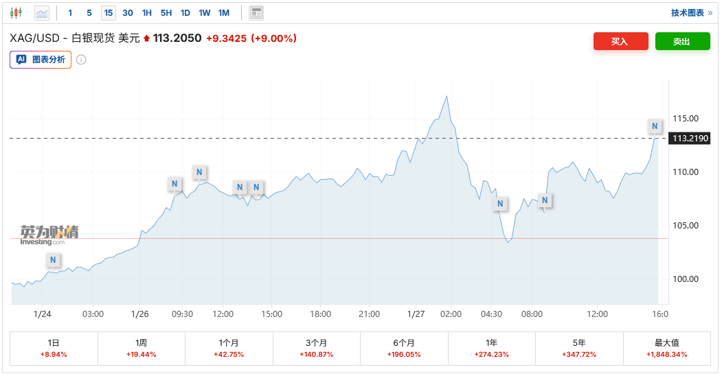 继2025年涨超一倍、创1979年以来最佳年度表现后,白银在2026年继续狂飙,迄今上涨约50%。周一,白银现货一度涨至117.74美元/盎司的纪录新高,并创下自2008年全球金融危机以来的最大单日涨幅,尽管随后跳水并抹去全部日内涨幅,收报约103.7美元/盎司。截至发稿,白银现货涨9.00%,报113.205美元/盎司。