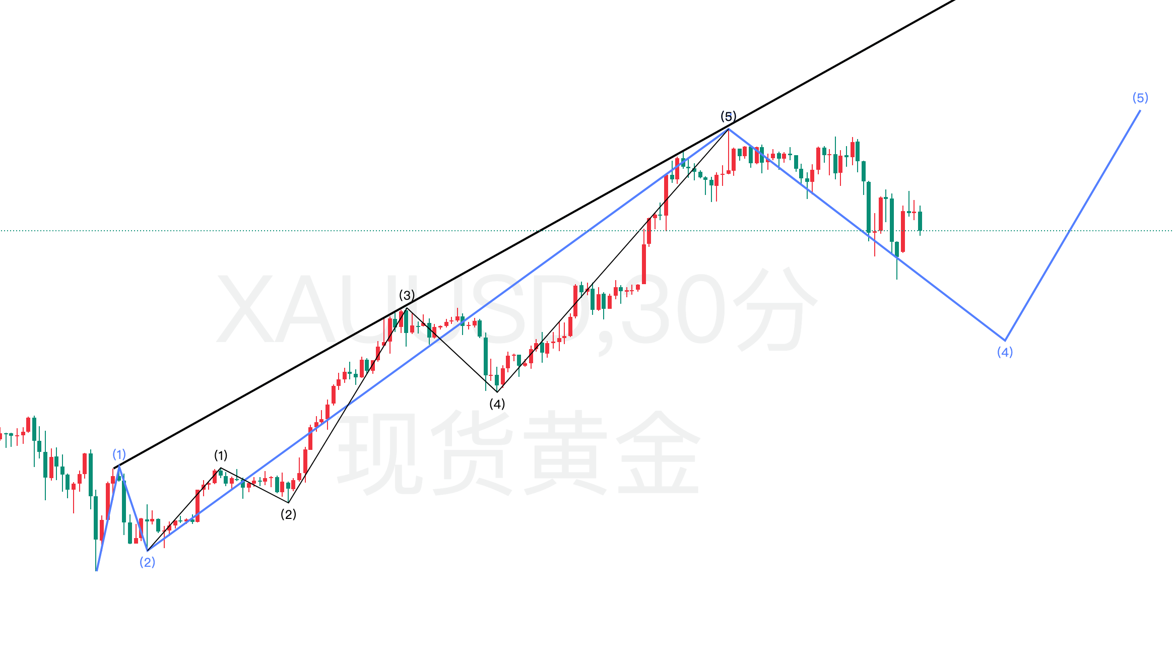 2、四小时级别:浪型结构分析思路保持不变,当前黄金处于自4756点位开启的5浪上涨行情中的5-5子浪阶段。日线级别需持续跟踪价格上涨延续性,同时警惕短期行情触及顶部后开启调整结构。