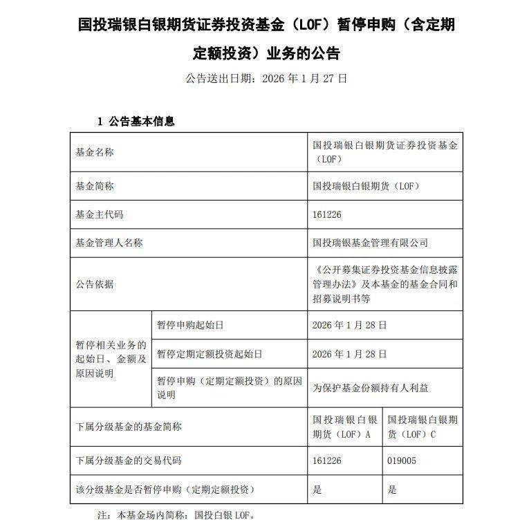 1月26日,国投白银LOF公告,将于1月28日起暂停申购(含定期定额投资)业务。
