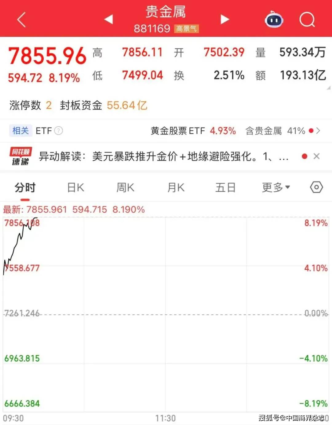 贵金属板块持续走强,中国黄金、湖南黄金涨停。
