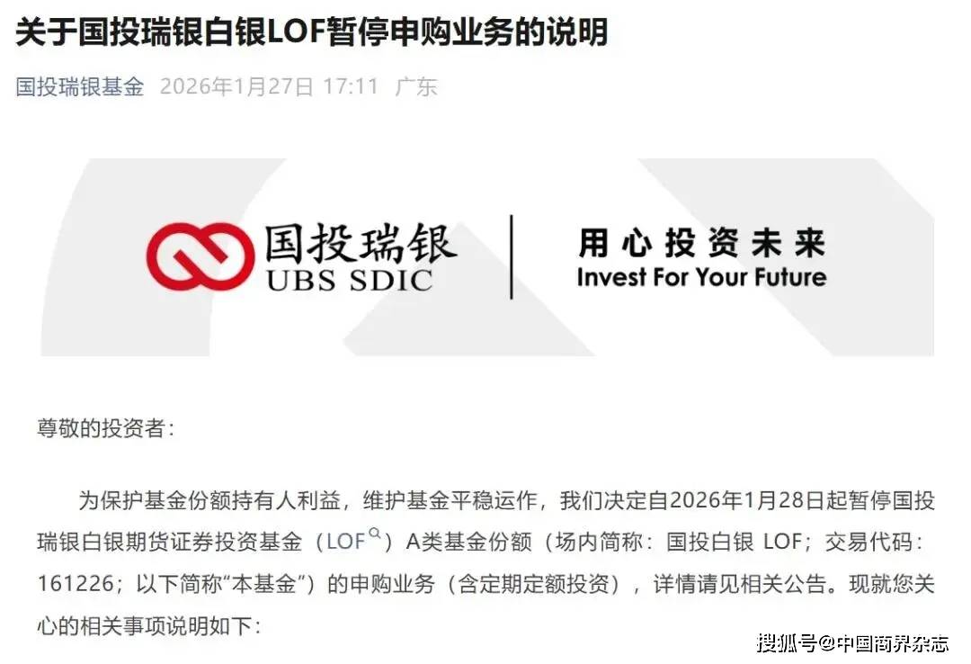 国投瑞银基金表示,为保护基金份额持有人利益,维护基金平稳运作,决定自1月28日起暂停国投瑞银白银期货证券投资基金(LOF)A类基金份额(以下简称国投白银LOF)的申购业务(含定期定额投资)。