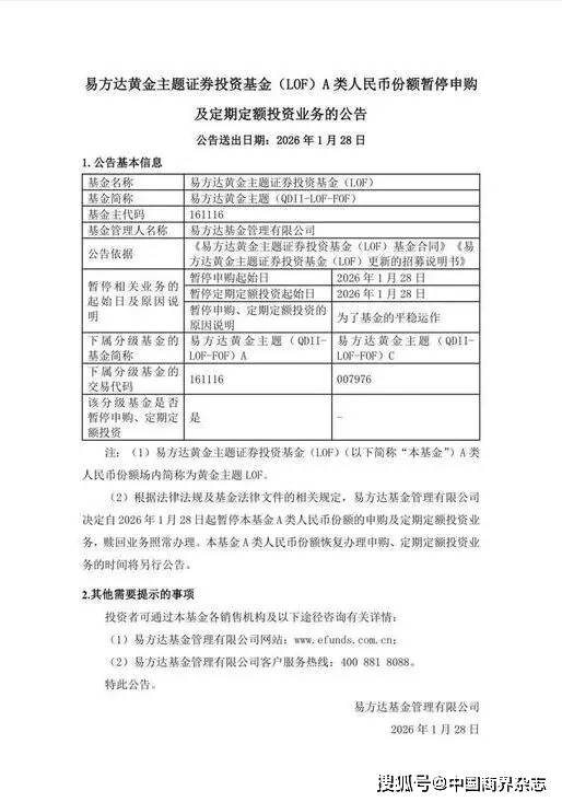 在贵金属市场狂热之下,风险管控措施升级。1月27日晚间,易方达黄金主题LOF(上市型开放式基金)发布公告称,易方达基金决定自1月28日起暂停该基金A类份额的申购及定期定额投资业务,赎回业务照常办理。该基金A类份额恢复办理申购、定期定额投资业务的时间将另行公告。
